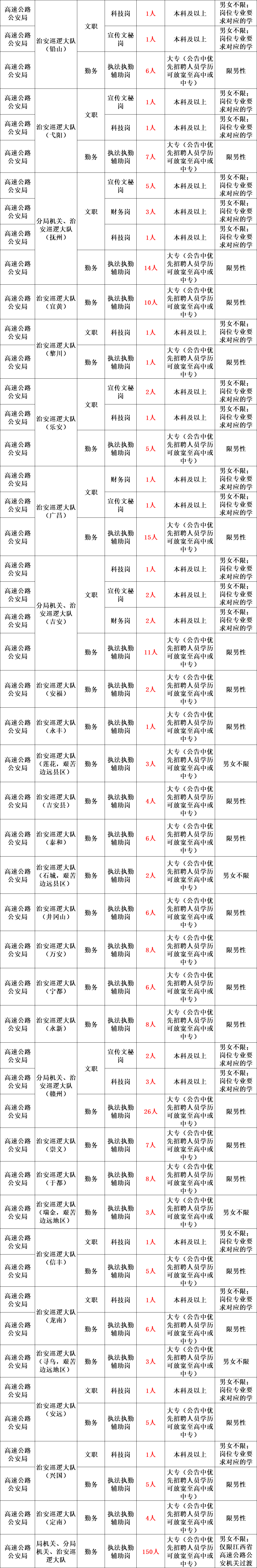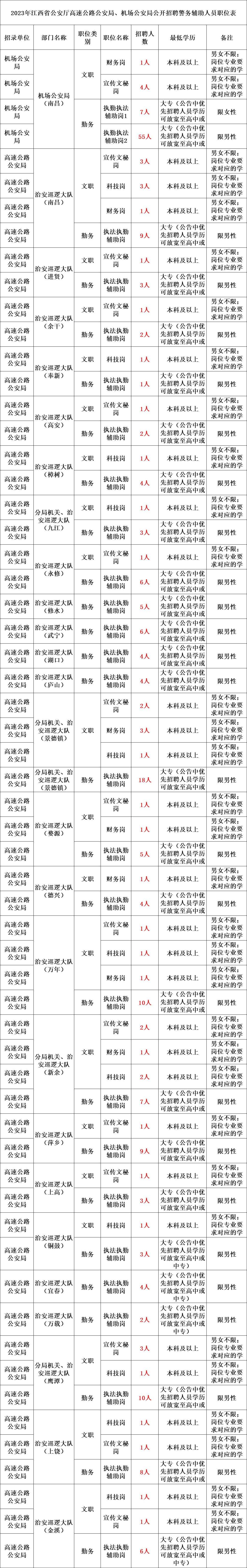 根据《江西省公安机关警务辅助人员条例》及相关规定,结合当前公安工作需求,江西省公安厅高速公路公安局、机场公安局决定面向社会公开招聘警务辅助人员(以下简称“辅警”),现将有关事项公告如下: