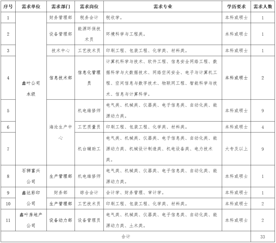 本次招聘范围为鑫叶公司本级、鑫达彩印公司、石狮富兴公司、鑫叶房地产公司。为适应鑫叶公司持续健康发展需求,现竭诚欢迎您加入鑫叶公司,具体招聘信息如下。