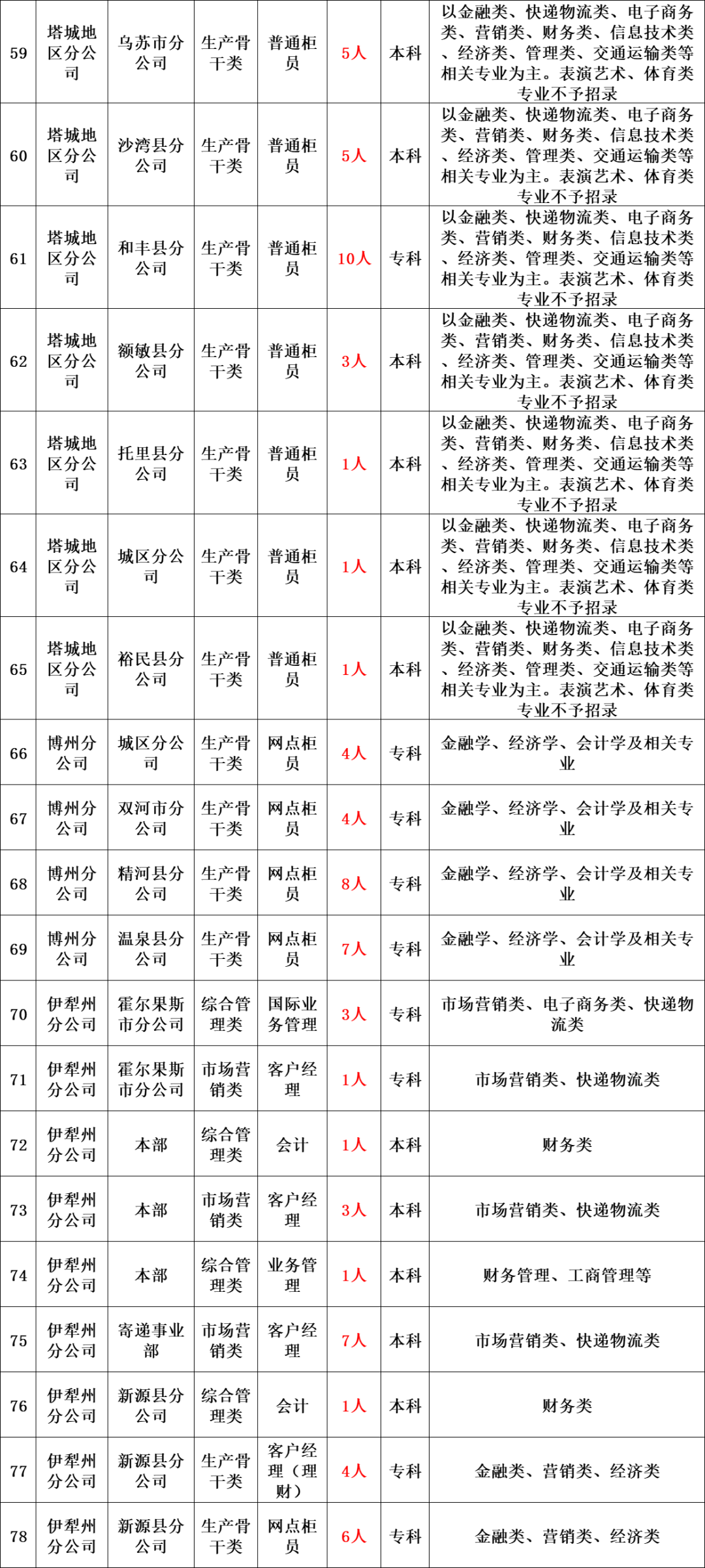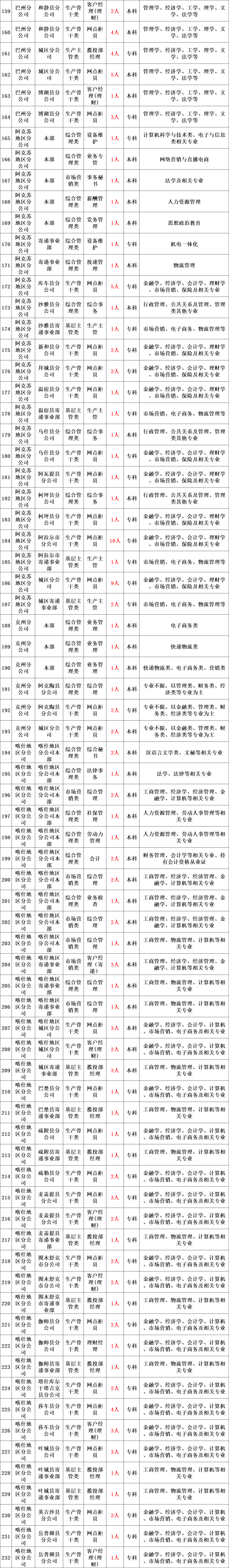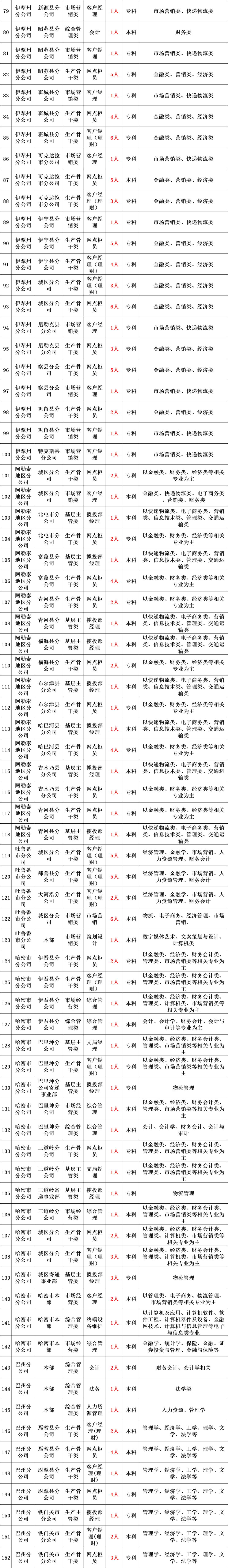 中国邮政集团有限公司新疆维吾尔自治区分公司,是中国邮政集团有限公司在新疆行政区域范围内设立的省级公司,主要负责区内邮政通信网的建设、运行、经营与管理,受政府委托承担普遍服务和特殊服务义务。下辖16个地州(市)分公司、87个县(市、区)分公司、1500余个营业网点。现就辖区内分公司开展校园招聘工作,诚招各类人才和优秀毕业生的加入,携手共创新疆邮政美好未来!