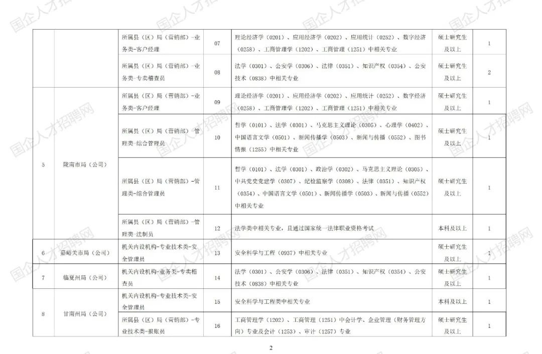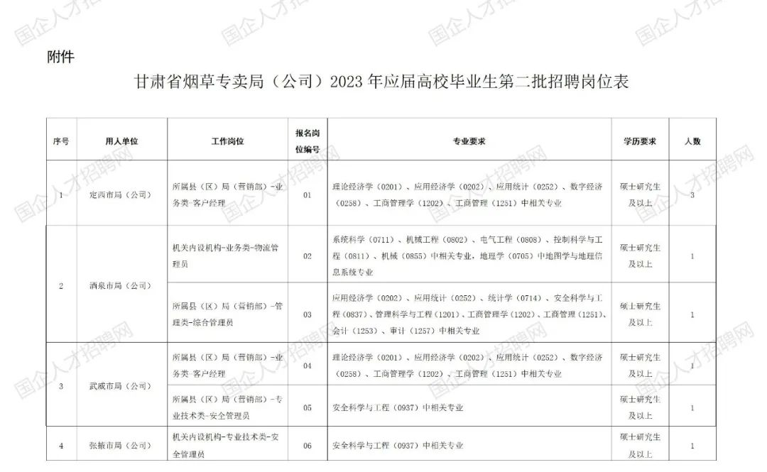 附件:甘肃省烟草专卖局(公司)2023年应届高校毕业生第二批招聘岗位表