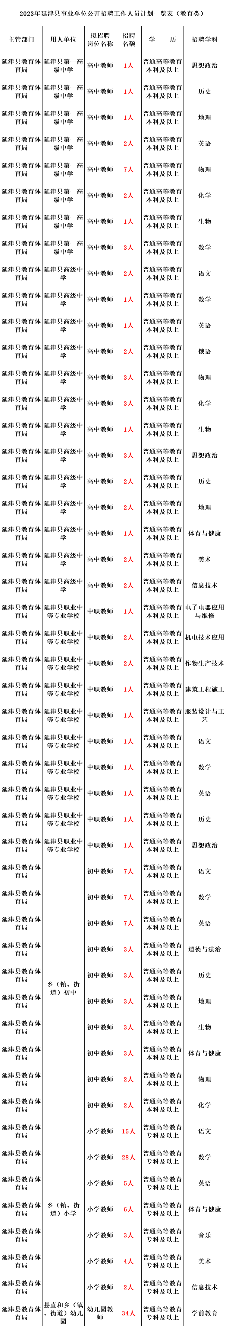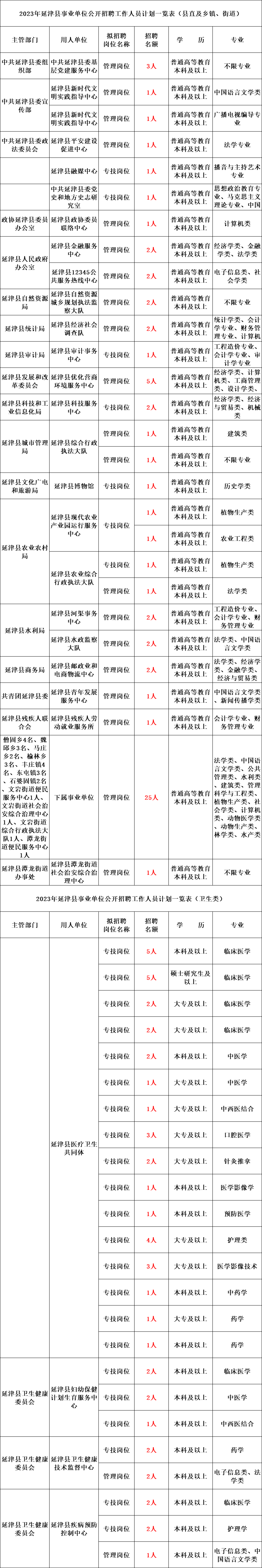 具体招聘单位、岗位、人数、岗位条件等内容详见《2023年延津县事业单位公开招聘工作人员计划一览表》。