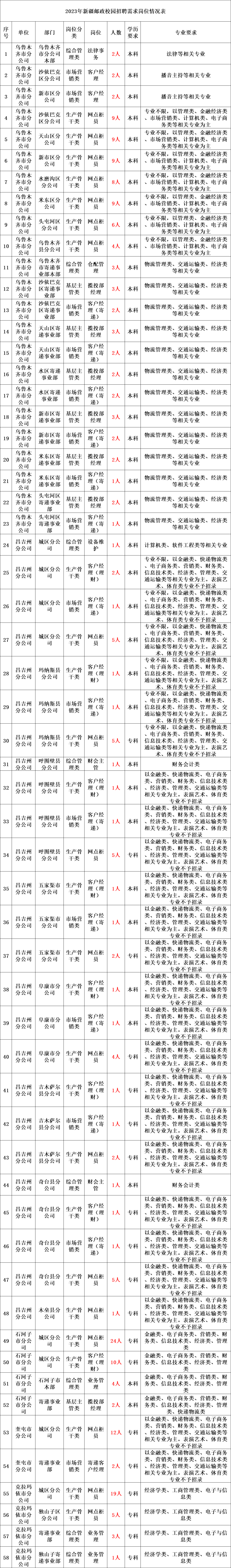 具体招聘岗位详见附件一《2023年中国邮政集团有限公司新疆维吾尔自治区分公司校园招聘职位表》。