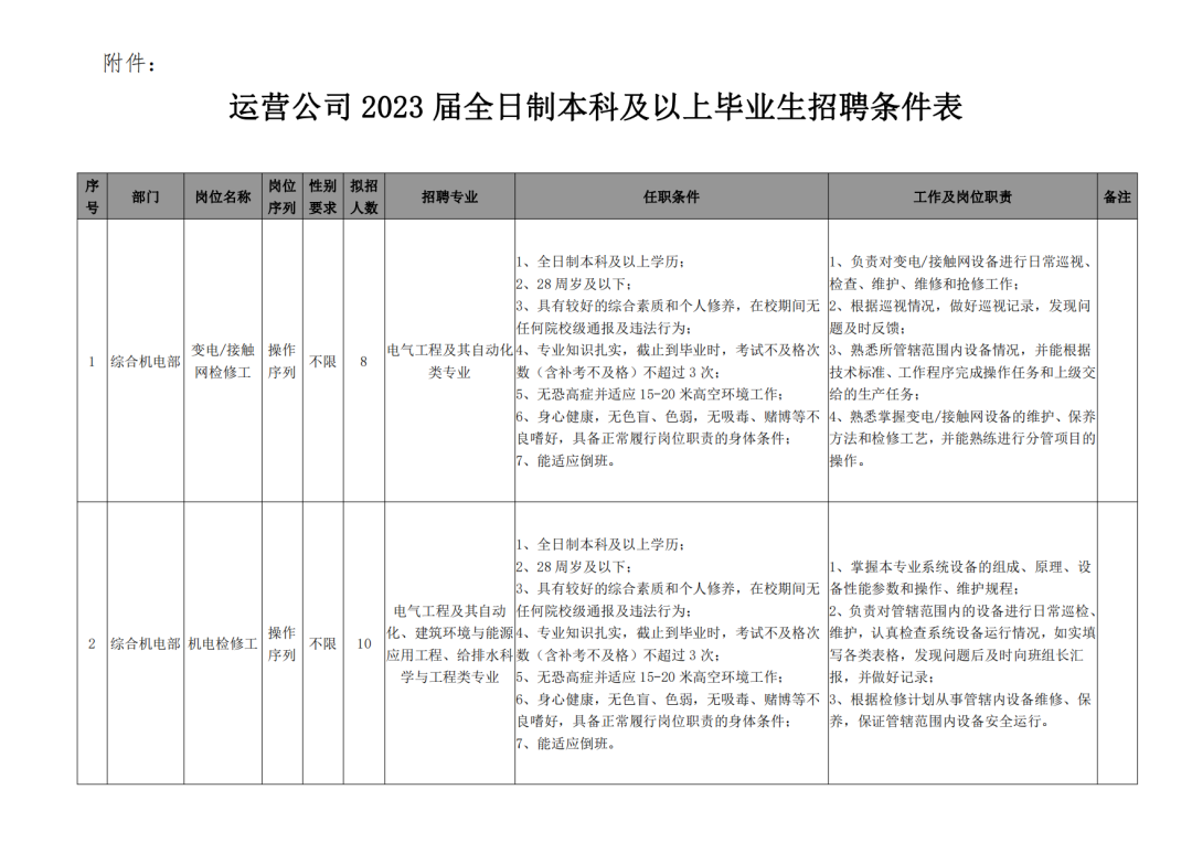 各岗位具体招聘条件详见附件:《运营公司2023届全日制本科及以上毕业生招聘条件表》。