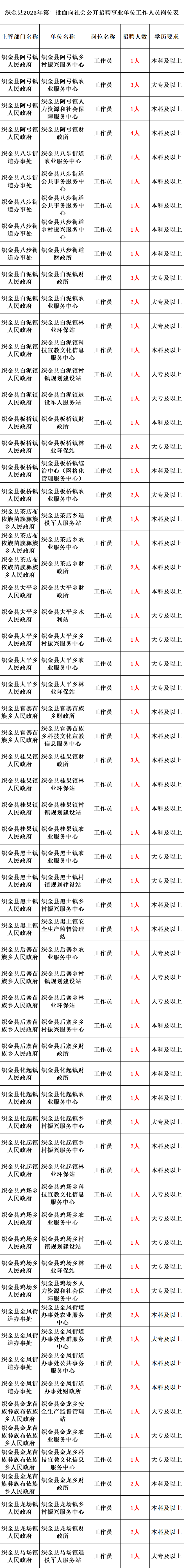 招聘岗位及要求详见《织金县2023年第二批面向社会公开招聘事业单位工作人员岗位表》(以下简称《岗位表》,详见附件1),岗位专业要求参照贵州省人力资源和社会保障厅官网上的《事业单位公开招聘专业设置参考目录》设置。