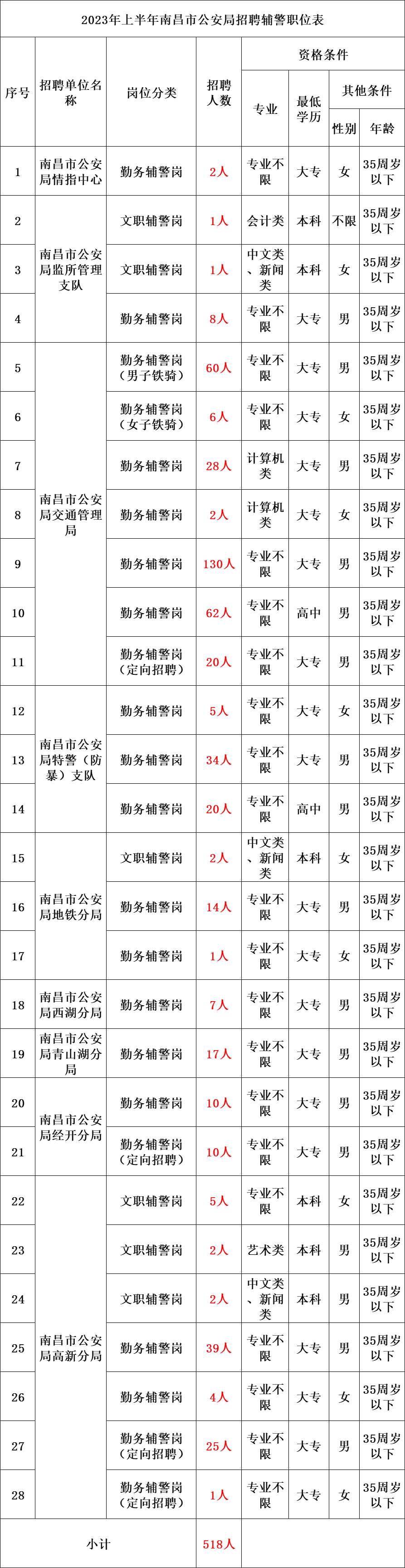 (二)招聘岗位:南昌市公安员额制辅警。(具体职位、人数和资格条件详见附件1)