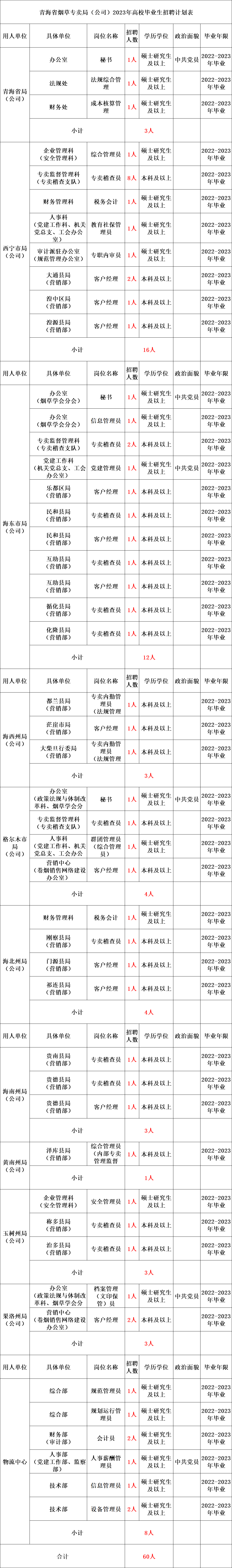 本次计划招聘60人,具体用人单位、岗位名称、招聘人数及资格条件等详见《青海省烟草专卖局(公司)2023年高校毕业生招聘计划表》(附件1)。