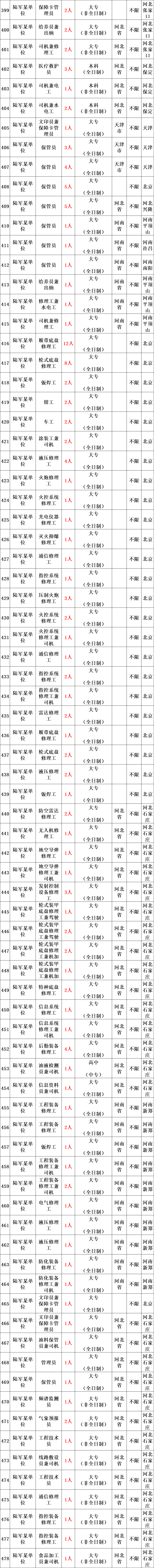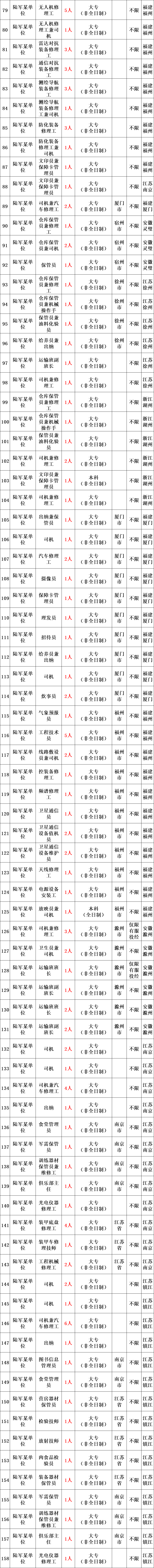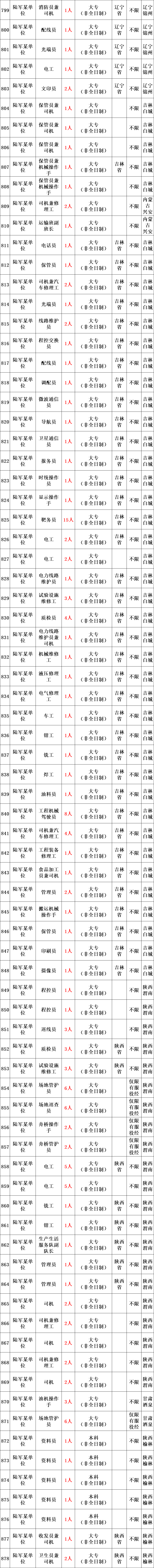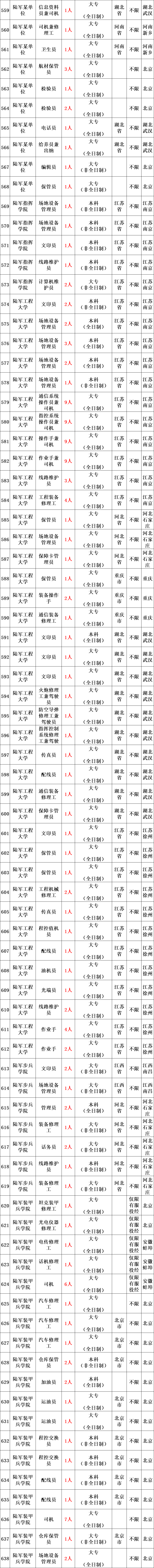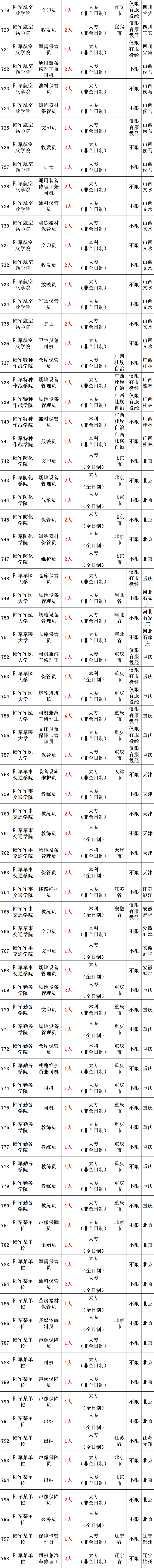 陆军所属用人单位的教练员、保管员、修理工、出纳、卫生员、司机等专业技能三级以下岗位,共招考1873人。
