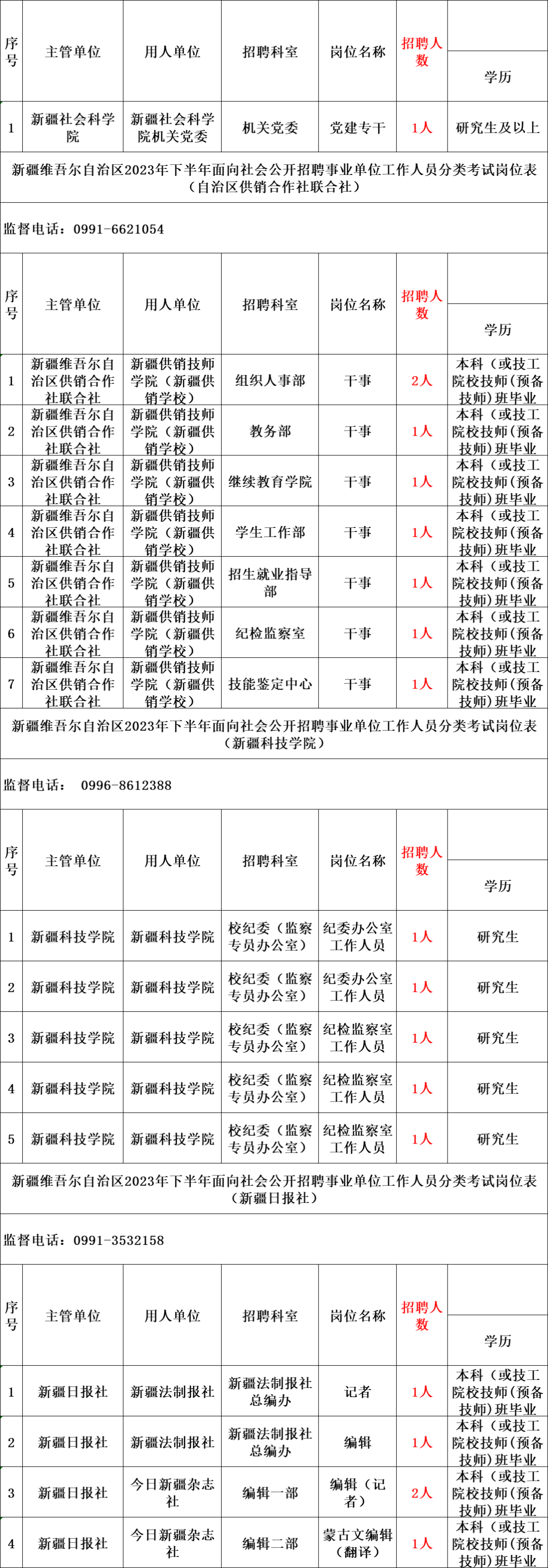 根据《事业单位人事管理条例》(国务院令第652号)、《自治区事业单位面向社会公开招聘工作人员办法》(新人社发〔2013〕141号)等有关规定,按照公开、平等、竞争、择优的原则,受各招聘单位委托,自治区人力资源和社会保障厅组织实施2023年下半年面向社会公开招聘事业单位工作人员分类考试笔试工作,本次公开招聘共计1818个岗位2759人。现将有关事项公告如下: