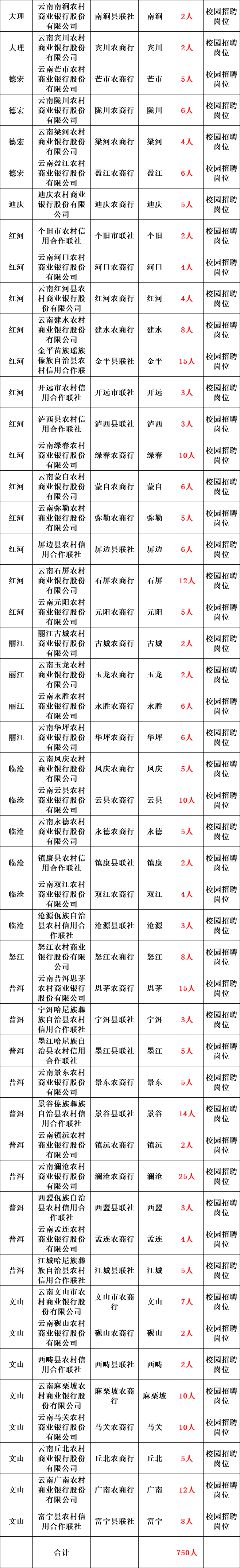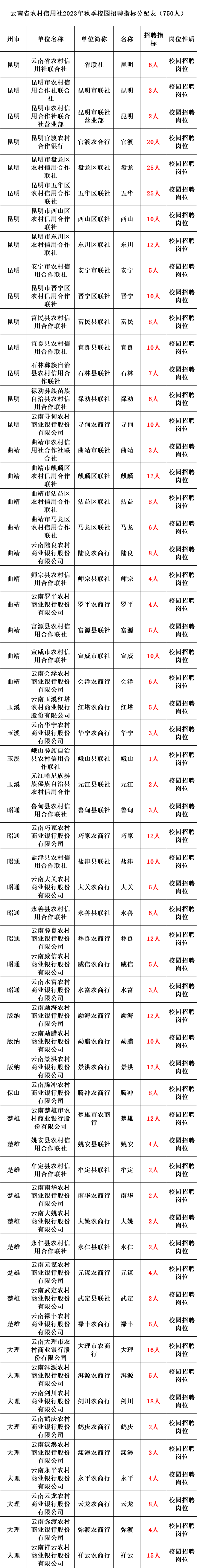 云南农信致力于打造“小而美、聚而精、品牌佳、口碑好”的中国一流现代金融企业,全力开创云南农信改革发展的新局面,现面向国内外院校招聘优秀高校毕业生,指标合计750人。具体如下: