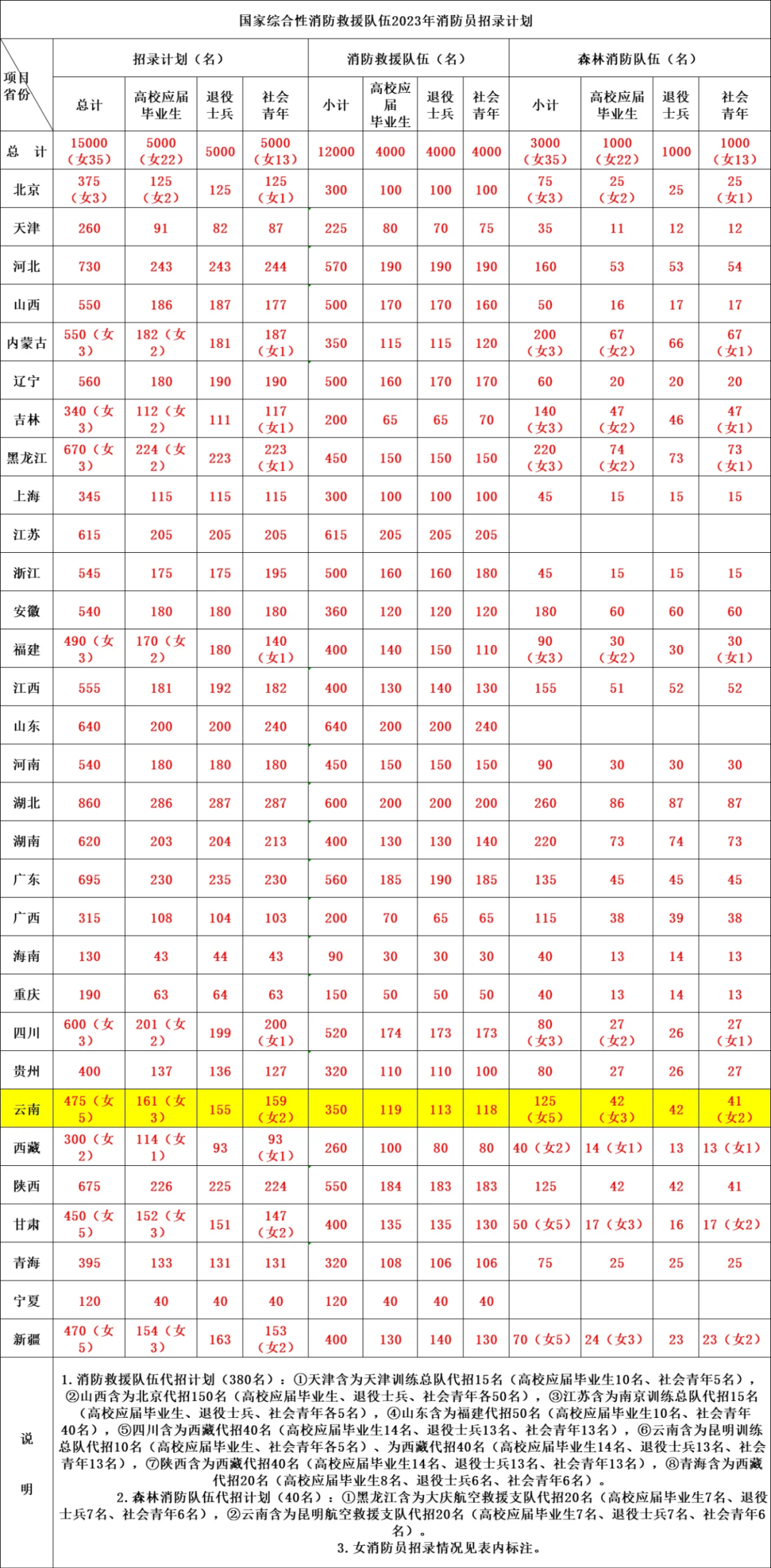 经应急管理部、人力资源社会保障部、退役军人事务部批准,此次国家综合性消防救援队伍共招录消防员15000名(女性35名),其中:高校应届毕业生5000名(女性22名)、退役士兵5000名、社会青年5000名(女性13名)。具体招录计划见附件1。