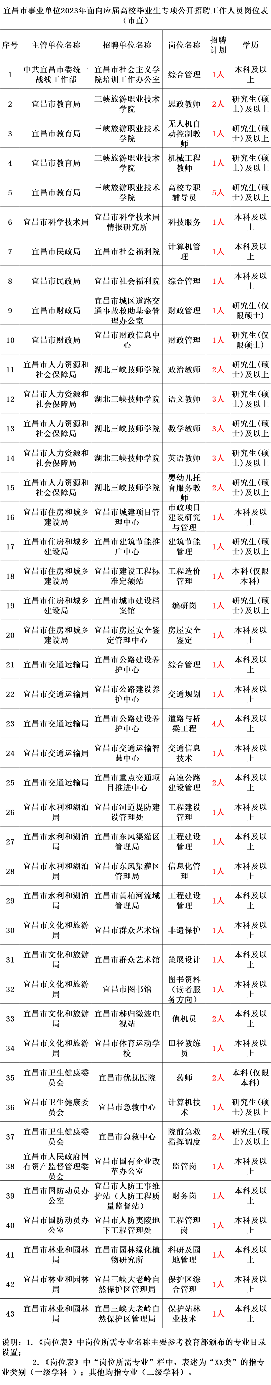 此次计划招聘221人。其中,宜昌市市直63名,宜都市9名,枝江市86名,当阳市12名,远安县4名,兴山县2名,秭归县19名,长阳土家族自治县5名,五峰土家族自治县6名,西陵区3 名,点军区4名,猇亭区5名,宜昌高新区3名。宜昌市市直和各县市区招聘岗位详见《宜昌市事业单位2023年面向应届高校毕业生专项公开招聘工作人员岗位表》(附件1,以下简称《岗位表》)。