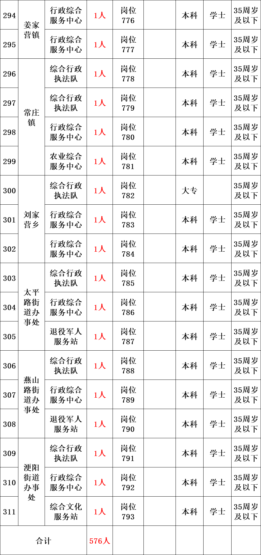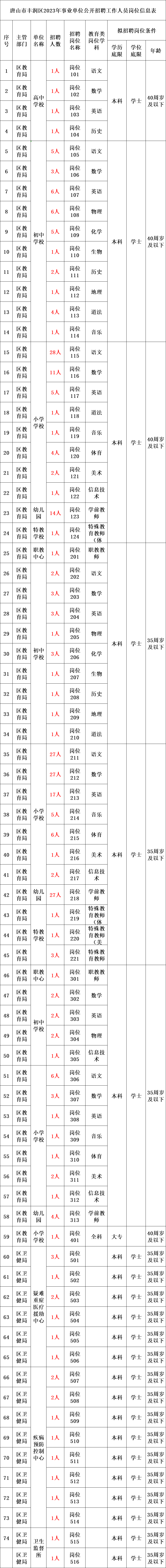 参加本次公开招聘的事业单位共招聘工作人员576名,各招聘单位的拟招聘人数、岗位条件等详见《唐山市丰润区2023年公开招聘事业编制工作人员岗位信息表》(附件1,以下简称《岗位信息表》)。